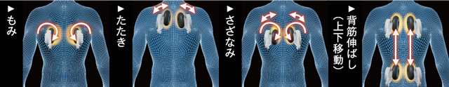 ポイントをとらえる2つのもみメカは、まるでプロのマッサージ師のような満足感のあるもみ心地。基本を押さえた4タイプのもみ技が背中をしっかりほぐします。